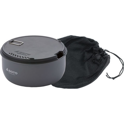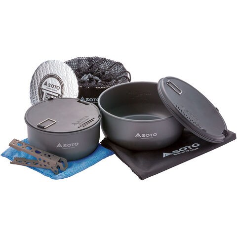多くの機能を備え、耐摩耗性にも優れたクッカーセット.一般的なアルマイト加工により皮膜の厚い[スーパーアナダイズド加工]を採用.耐衝撃性、耐食性にも優れます.保温力を高めるコジ-、様々な使い方ができるリッド(フタ)、トングとしても使えるリフターなど機能性も多様なクッカーセット.