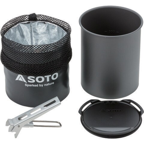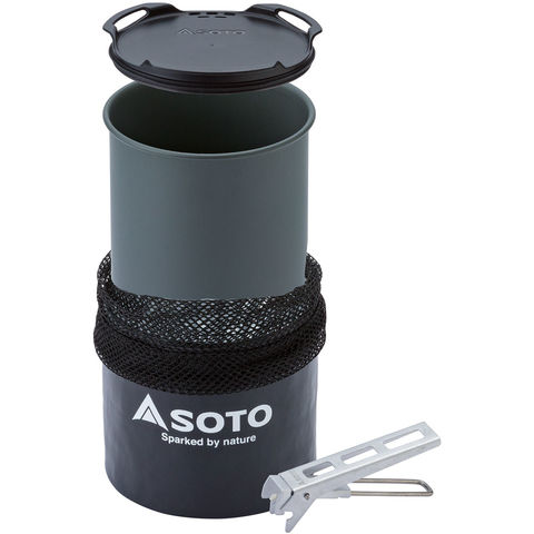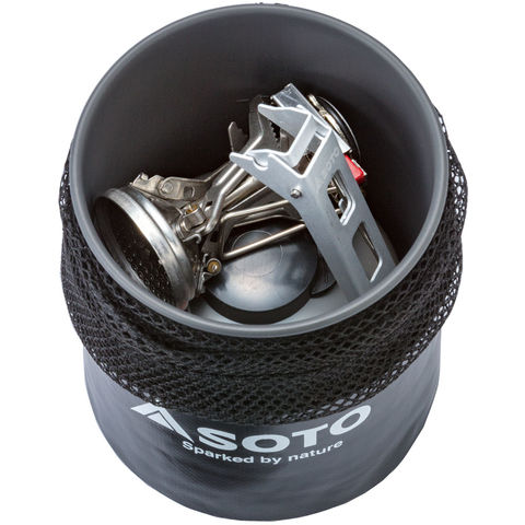 簡易的なクッカーとしても使用できるマグセット.マグのままコンロの火に掛け、そのままコジーで保温しながら使えます.マグの中にシングルストーブを.コジーにはOD110缶が収納できます.