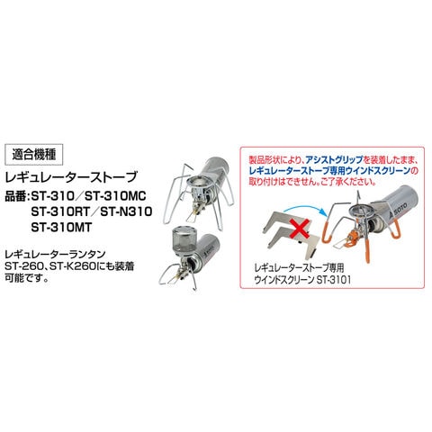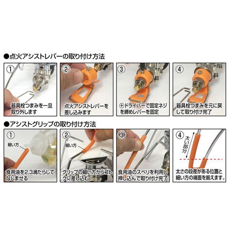 レギュレーターストーブST-310を使いやすくアシストする2点セット.オレンジ、イエロー、ブルーの3色.点火アシストレバー=大きなレバーで点火操作をアシストします.アシストグリップ=ゴトクのスベり止め効果とゴトクの伝道熱をカバーします.※取り付け時に食用油とプラスドライバーが必要です.