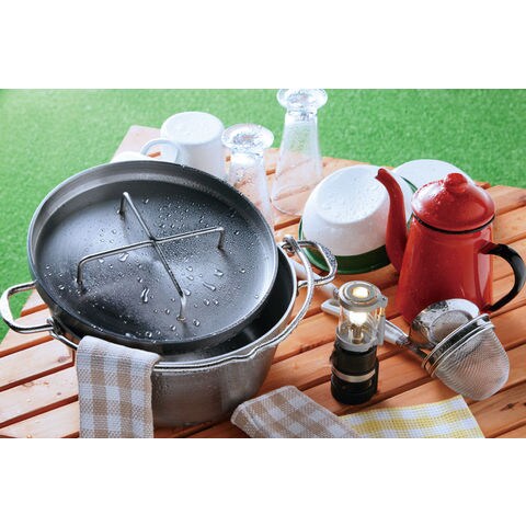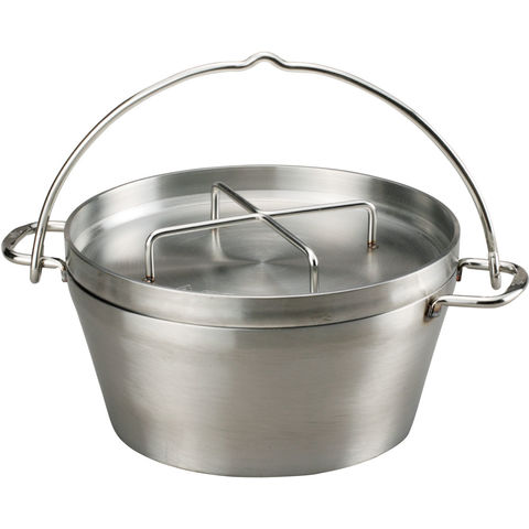 蓄熱性に優れた4ミリ厚のステンレス鋼板.耐衝撃性も抜群!底が平らなため家庭のガスコンロ、オーブン、電磁調理器等でも使用できます.IHクッキングヒーター対応.鉄製のダッチオーブンのようなシーズニングは不要.お手入れも簡単.