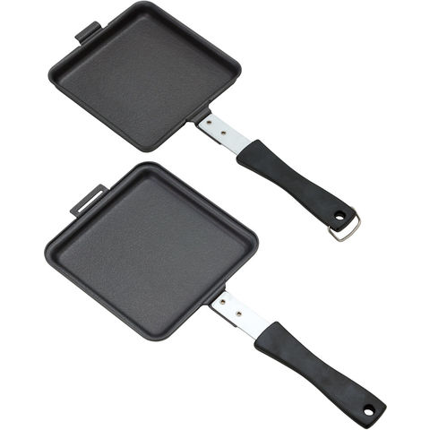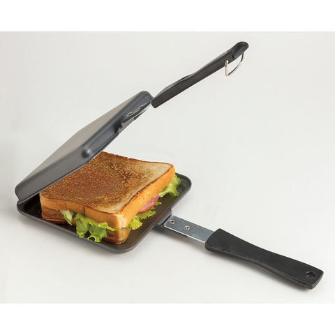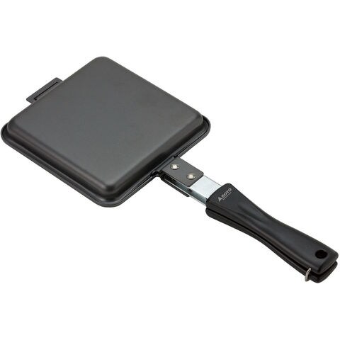 アウトドアで、自宅で簡単にオリジナルホットサンド!はさんだまま焼けるので失敗せず、両面こんがり!フックをはずして1枚のフライパンとしても使えます.日本製