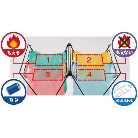 レジ袋を利用してゴミを4分別できるコンパクトダストスタンド.一般的なレジ袋(15L)を使用することができるので非常に経済的です.2分別から最大4分別までできるので、撤収の際に処理しやすくなります.(※こちらはフレームのみの商品です.フレームのみでも使用可能です.カバーは別売の[UFダストスタンドカバー](品番:611876/611883/611890)をご使用ください.)