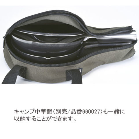 スキレットを安定して持ち運べる専用ケース.フタ用ポケットが付いた専用設計.フタを収納する際は取っ手が下向きになるようにポケットに入れてください.別売のキャンプ中華鍋(品番660027)と一緒に収納できます.