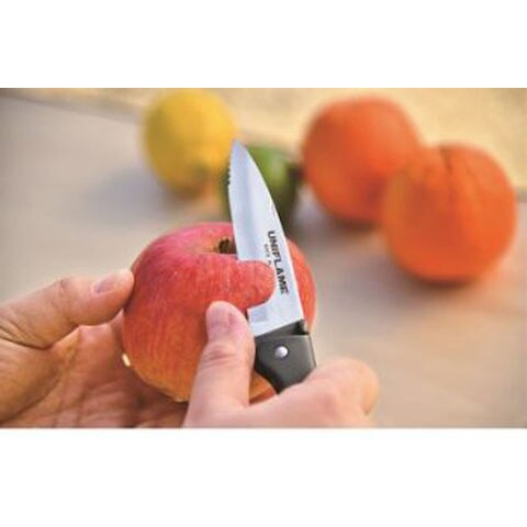 仕様:先端のギザ刃がしっかり噛んで切りやすい形状、先端以外はストレート刃でキッチンナイフとして使えます.
