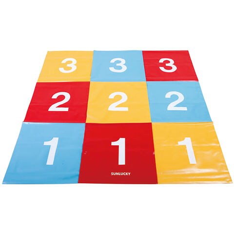 【トリコロキューブ】3色27個のサイコロキューブを、3組がそれぞれ9個ずつ目標シートに投げ入れ、その出目とシート上の得点エリアの合計点数により勝敗を競うゲームです.こちらは競技に使用するマットのみになります.
