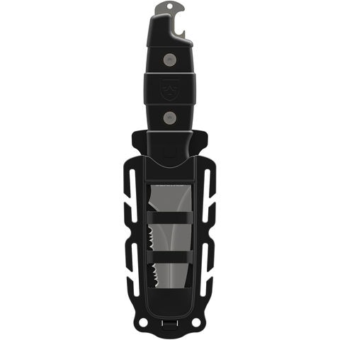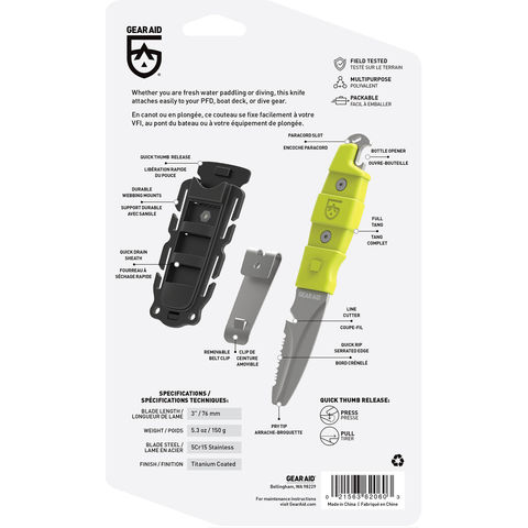 アクアリバーナイフは、カヌーやパックラフトなどのウォータースポーツに適したチタンコーティングの錆びにくいナイフです.PFD やベルトに簡単かつ確実に取り付けられるベルトクリップ付き.刃の先端はとがっていないのでインフレータブル製品を守ることができ、ロープや釣り糸を切るためのラインカッター、ストレート刃、鋸歯状と3 種類の刃を装着.