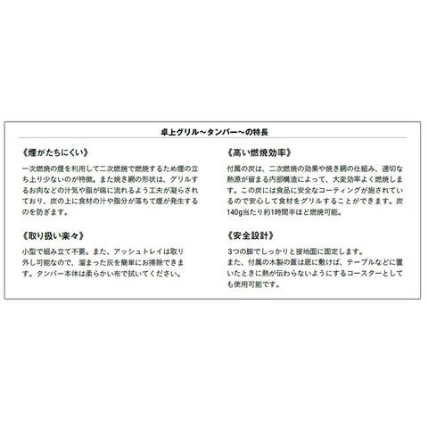 小型のBBQグリルです.グリルプレートには焦げ付きにくいようエナメル加工が施されています.グリル内の温度を一定に保つ換気口があるため、食材が均一に焼き上がります.また、木の蓋は耐熱コースターとして使えるので、下に敷けばテーブルにおいても焦がさず卓上グリルを楽しめます.