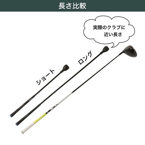 ゴルフスイングに求められる体の動きの基本を体得できるスイング練習用具です.よりクラブに近いイメージで練習ができるロングタイプ!適度なヘッドの重さと巻きつくようなシャフトのしなりを感じながら繰り返し素振りを行うことで遠心力だけに頼らない安定したスイングプレーンをマスターすることが可能です.また、音を聞きながら素振りを行うことで一人でも正しいスイングが出来ているか確認でき、インパクトのタイミングやスイングのリズムを確立させるトレーニングができます.余計な力みのない素直なスイングを身につけたい方におすすめです.