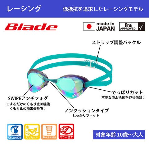 仕様:こするだけでくもり止め効果が復活するSWIPE搭載、まぶしさを抑え、集中力を高めるミラータイプ、屋外での使用でも安心のUVカットレンズ、フェイスラインによって選べる5サイズの鼻ベルト付、Fina認証モデル
