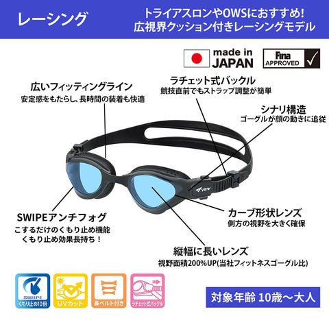 仕様:こするだけでくもり止め効果が復活するSWIPE搭載、競技直前でもベストなフィッティングを実現できる[ラチェット式バックル]搭載、アウトドア使用にぴったりのUVカットレンズ、フェイスラインによって選べる3サイズの鼻ベルト付、Fina認証モデル