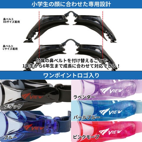 ビュー VIEW スイミングゴーグル 子ども用 スワイプ アンチフォグ SWIPE 小学生 6~12歳 水中メガネ UVカット くもり止め 選べる鼻ベルト 抗菌仕様 キッズ V722JSA BL