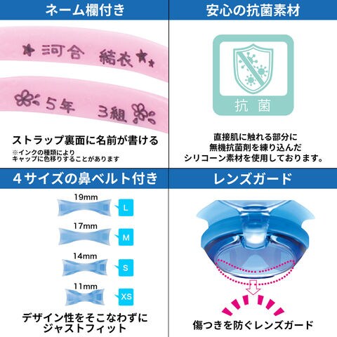 機能:くもり止め10倍、UVカット、選べる鼻ベルト(XS・S・M・L)、抗菌、キズ防止加工、ネーム