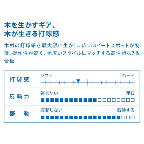 木を生かすギア、木が生きる打球感.木材の打球感を最大限に生かし、広いスイートスポットが特徴.操作性が高く、幅広いスタイルにマッチする高性能な7枚合板.