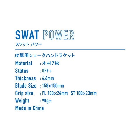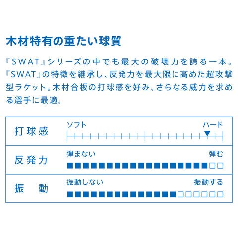 『SWAT』シリーズの中でも最大の破壊力を誇る一本.『SWAT』の特徴を継承し、反発力を最大限に高めた超攻撃型ラケット.木材合板の打球感を好み、さらなる威力を求める選手に最適.