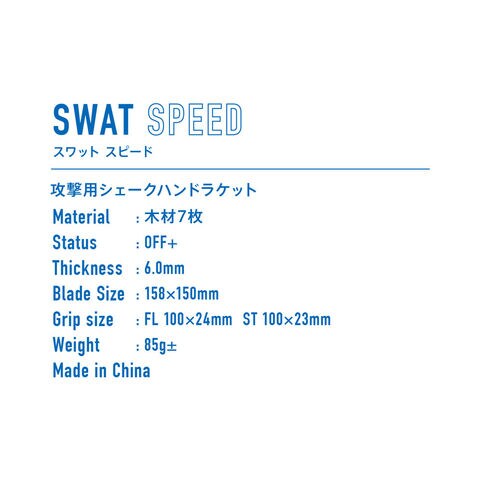 『SWAT』シリーズの中でも最大のスピードを持つ一本.『SWAT』の特徴を継承し、スピード(球離れの速さ)を追求し前陣での戦いで最大限の力を発揮する.現代卓球において主体となっている回転系ラバーとの相性も抜群で、力強いラリー戦にも対応可能.