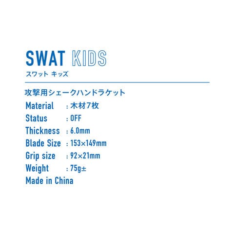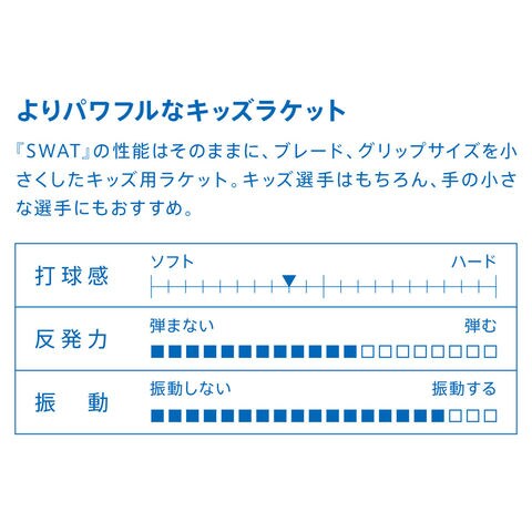 『SWAT』の性能はそのままに、ブレード、グリップサイズを小さくしたキッズ用ラケット.キッズ選手はもちろん、手の小さな選手にもおすすめ.