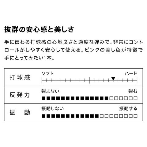手に伝わる打球感の心地良さと適度な弾みで、非常にコントロールがしやすく安心して使える.ピンクの差し色が特徴で手にとってみたい1本.