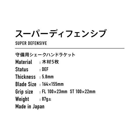 仕様:守備用シェークハンドラケット、打球感/SOFT、反発力/5.5、振動/9.0