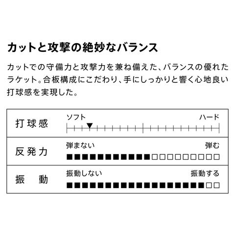 カットでの守備力と攻撃力を兼ね備えた、バランスの優れたラケット.合板構成にこだわり、手にしっかりと響く心地良い打球感を実現した.