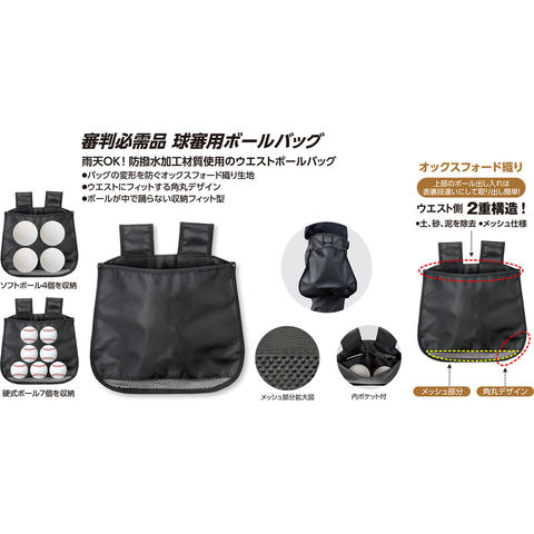 仕様:ボールバッグ/全天候型防撥水加工、球審用ブラシ/スクレーパー機能・3列植毛、インジケーター/BSOメジャー式