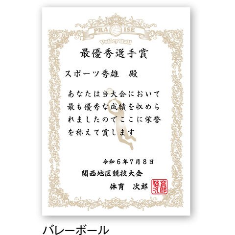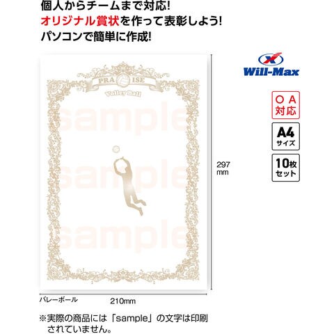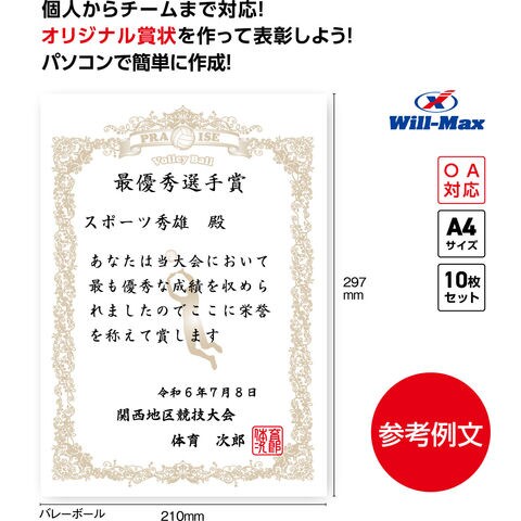 ユニックス UNIX 種目別賞状用紙 バレーボール 賞状 A4 10枚 テストプリント用紙 参考文例 簡単作成 試合 ゲーム 用品 表彰用品 表彰状 最優秀選手賞 文字カラー FD1385