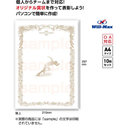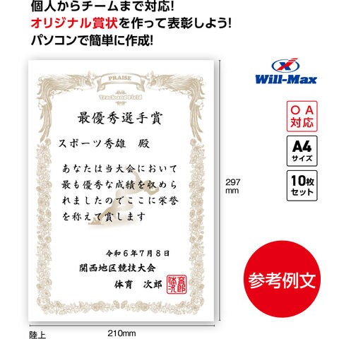 内容:A4サイズ賞状用紙10枚+テストプリント用紙1枚入り(テストプリント用紙の裏面に参考文例があります)