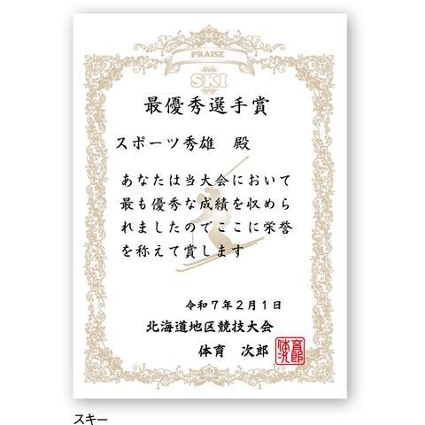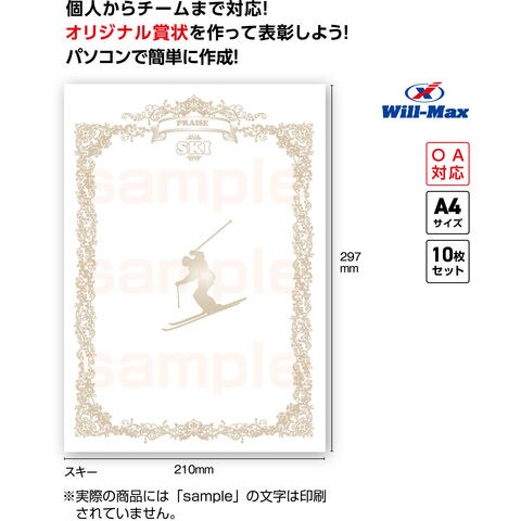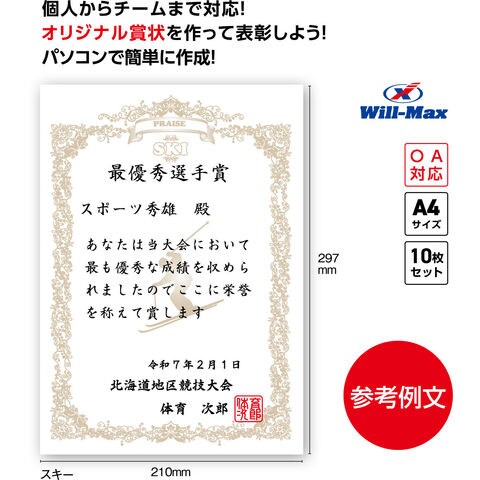 ユニックス UNIX 種目別賞状用紙 スキー 賞状 A4 賞状用紙10枚 テストプリント用紙 参考文例 簡単作成 試合 ゲーム 用品 表彰用品 表彰状 最優秀選手賞 文字カラー FD1393