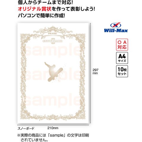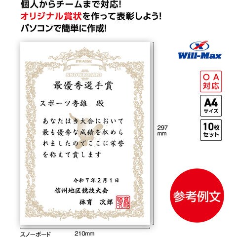 ユニックス UNIX 種目別賞状用紙 スノーボード 賞状 A4 賞状用紙10枚 テストプリント用紙 参考文例 簡単作成 試合 ゲーム 用品 表彰用品 表彰状 最優秀選手賞 文字カラー FD1394
