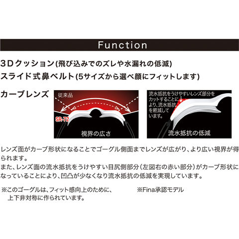 流水抵抗の低減を実現した[カーブレンズ]クッション付モデル.くもり止め効果長持ち4倍の[PREMIUM ANTI-FOG]を採用.飛び込みやターンでブレない3Dクッション付レーシングゴーグル.FINA承認モデル.