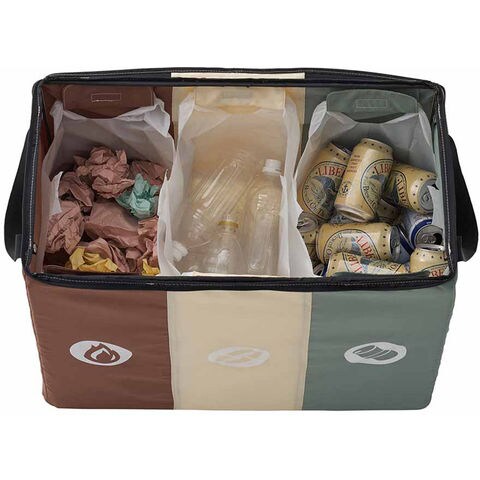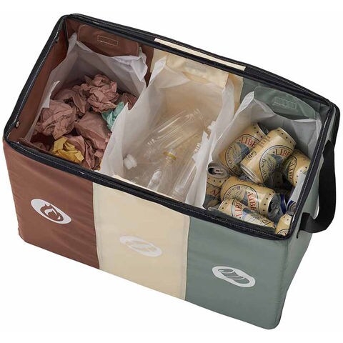 機能:3つのゴミ袋がセットできるから3種類に分別できます.蓋付きだからカラスや臭いも気にならない.グッズを入れて出発→キャンプ場でゴミ箱に変身!簡単にたためる薄型収納.