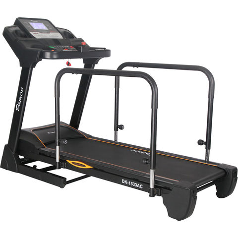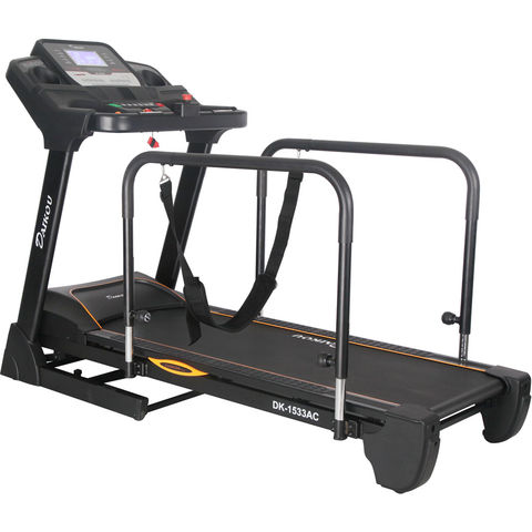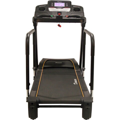 手すり付きで前進、後進ともに0.2kmからお使い頂ける低速ウォーカーですので、リハビリ施設等に最適です.電動傾斜で負5、正12段階調整ができます.軽頻度施設でお使いの場合でも、1年間の無償保証がつきます.