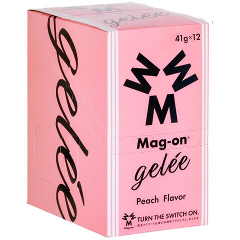 2020年2月に発売された[Mag-onジュレバナナ]と同じジュレシリーズ『ピーチ味』.半固形のゼリータイプのため咀しゃくしながら飲むことで唾液が分泌され胃に食べ物を入れる感覚があり、一般的なジェルタイプよりも長時間の運動でも胃があれることの予防にもつながる.ピーチの風味に程よい甘みが補給という行為ではなく、運動中でも味わう楽しみをプラスできる.Mag-onシリーズ同様にエネルギー120kcal・水溶性マグネシウム50mgを配合し、バナナ味と同様にカリウム180mgを含有している.