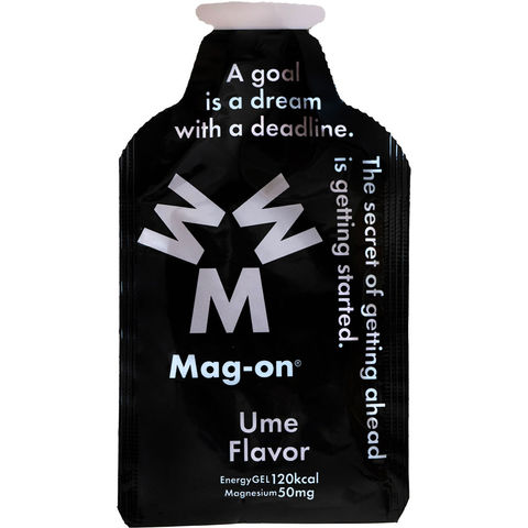 レースなどでの素早いエネルギー補給には欠かせないエナジージェルに水溶性マグネシウムをプラスしたMag-onエナジージェル.マルトデキストリンや果汁などをベースに、1個41gで摂取できるエネルギーは120kcal.一般的なエナジージェルと同等のスペックをもちつつ、Mag-onの最大の特徴である吸収率の高い水溶性マグネシウムを50mg配合している.