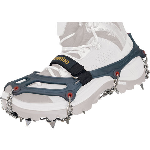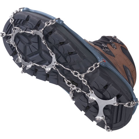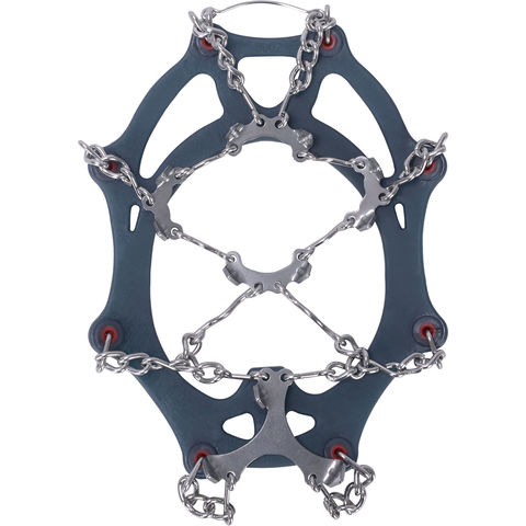 高強度ステンレス製の爪は、爪数が前8本、かかと3本(サイズSは前6本、かかと2本)あり、爪同士や爪と厚手のフィッティングラバーとの間を直径約2mmのステンレス製チェーンで接続しています.荒れた道でもチェーンが切れたり、爪が折れたり曲がったりする心配がありません.冬山のアプローチに好適です.チェーンとラバーをつなぐ穴はプラスチックアイレットで補強されています.付属の面ファスナー付きストラップはチェーンセンの横ずれを防ぎます.アイレットと同色パイピングカラーの専用防水ケース付き.