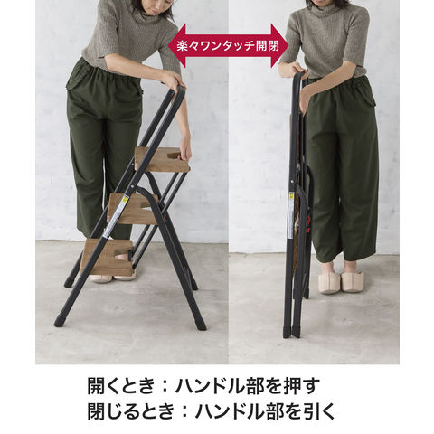 詳細:フレームのハンドル部分と、踏み台についているハンドルを左右に押し広げると簡単に開きます.転倒を防ぐロック機能付きなので作業中も安心.また、ストッパーがしっかりとロックしてくれるので移動時に閉じて指を挟む危険も防いでくれます.