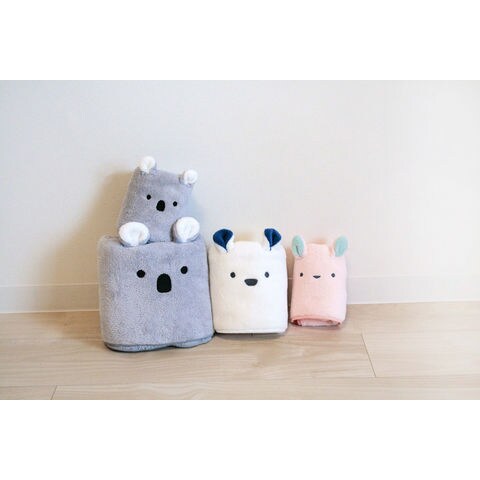 触れて・干して・畳んで楽しむ見た目も可愛いアニマルタオルシリーズ.ふんわりマシュマロタッチのマイクロファイバー製.吸水量は綿の約3倍.お洗濯後もサッと乾く実用的なタオル.畳むとぬいぐるみのようなタオルに.