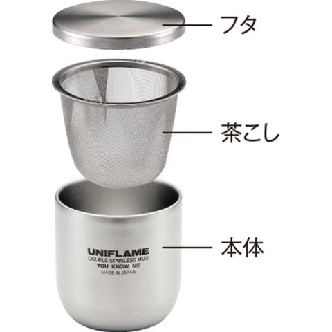 和風デザインの美しいフォルム.茶こしとフタが付属した、本格派のダブルステンレスマグ.茶こしを使って日本茶やハーブティなどが楽しめます.内部には[不働態処理]を施し、鉄臭さが飲み物に移りません.