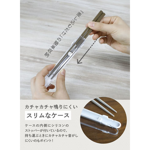 安全性の高い銀イオンの力で抗菌効果を発揮!※抗菌加工は、お箸のみです.ケースの内側にシリコンのストッパーが付いているので、持ち運ぶときにカチャカチャ音がしにくいのもポイント.天然木の塗り箸だから、しなりにくく、冷えたご飯もつかみやすい.箸先は滑り止め加工をしているので、おかずもつかみやすい.お箸の収納は[差し込むだけ]の簡単収納.スリムなケースの内側にストッパが付いています.お箸もケースも食器洗浄器対応なので、お手入れも簡単です.※使用する際は、蒸気・熱風・熱湯の吹き出し口の側に置かないで下さい.変形や破損の原因になります.