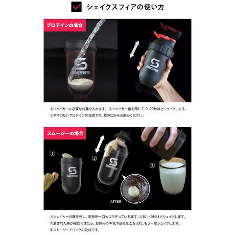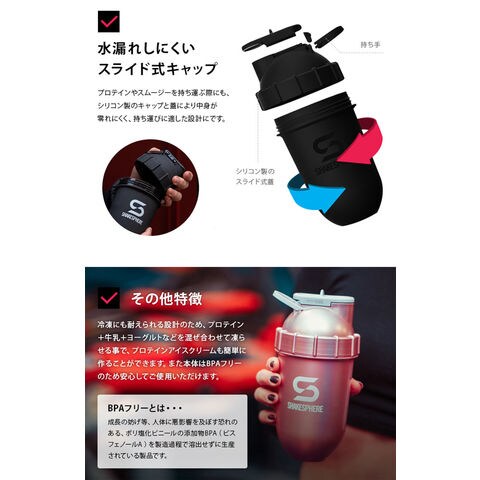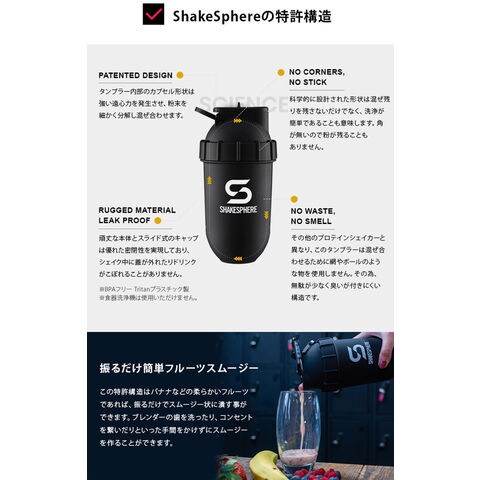 無駄なく良く混ざるカプセル型プロテインシェイカー.タンブラー内部のカプセル形状が強い遠心力を発生させ粉末を無駄なく攪拌し混ぜ合わせます.シェイクするだけでバナナ等の柔らかいフルーツをピューレ状に潰す事ができます.角のないカプセル型のため、角に粉末が残らず洗浄も簡単です.スライドキャップで中身が漏れにくいリークプルーフ構造.