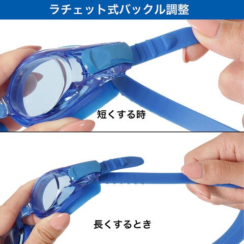 お子さまひとりでも簡単にストラップ調整ができるラチェット式バックルを採用したキッズ用スイミングゴーグル.レンズガードやUVカットも搭載になっているのではじめてのスイミングにおすすめです!