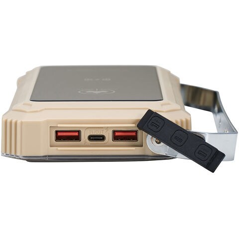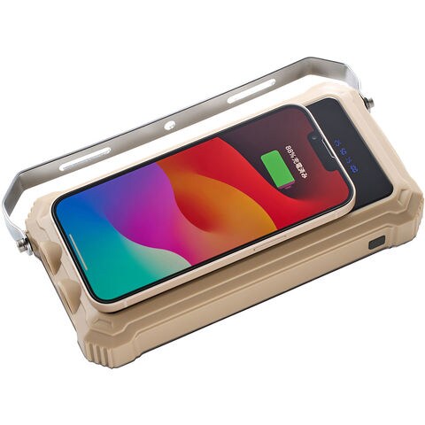 20000MAHのパワーバンク機能を兼ね備えた高輝度のランタン.スマートフォンを置くだけで充電できるワイヤレス充電機能が備わっているため、USBコード不要で外部機器への充電が可能です.スマートフォンやタブレットを同時に充電することが可能.側面にUSBポートが3口(USB TYPEC:1口、USB-A:2口) ございます.また逆側面には懐中電灯が備え付けられているため、夜間の移動も安心です.吊り下げて使用が可能となり、角度も無段階で調節することが可能です.