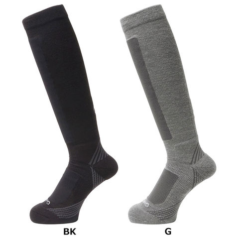 ウィンタースポーツに求められる機能を搭載したハイソックス.保温力と足裏感覚のバランスに優れた中厚タイプで、スキーやスノーボードの初級~中級者におすすめのアイテム.素材は、強度の高いナイロンと保温性や吸放湿性が高いウールなどを合わせており、耐久性と快適性を備えています.すね部分や足の甲は衝撃吸収性の高いパイル構造にし、くるぶしにパッドを配することで、ブーツのあたりを緩和.つま先やかかとは、クッション性の高いパイル仕様にしています.足裏にはクロステーピング構造を採用し、内側縦・外側縦・横の3つのアーチをサポート.