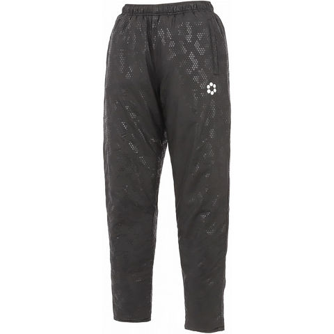 高い防風性と撥水性を兼ね備えた高級感のあるシャイニードビー素材.裏地のトリコット起毛は表裏で配し、保温性と快適な動きを同時に兼ね備えます.膝下のタフタ裏地とロングファスナー仕様は快適な着脱を実現します.ポケット裏甲側はトリコット起毛面を配置し、ウォーム感を確保しています. HEX BEAST エンボス加工で選手に自信を与えています.