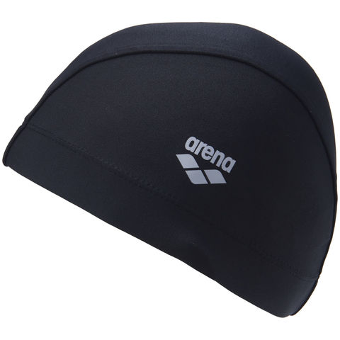 生地が柔らかくかぶりやすい、ワンポイントのテキスタイルキャップ.ベーシックなカラーなので、様々なフィットネス水着とコーディネートがしやすい.また水抜けが良いので、ムレ感がなく快適に泳ぐことが可能.ゆったり泳ぎたい健康志向スイマーにおススメ.ARENAロゴが着用者の左側になるように着用.