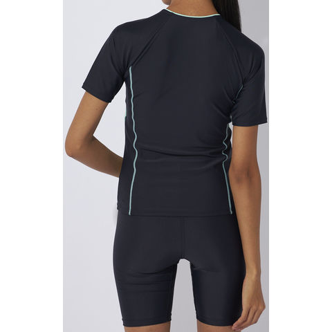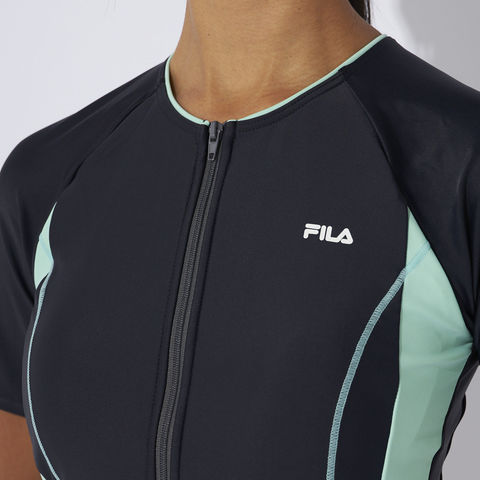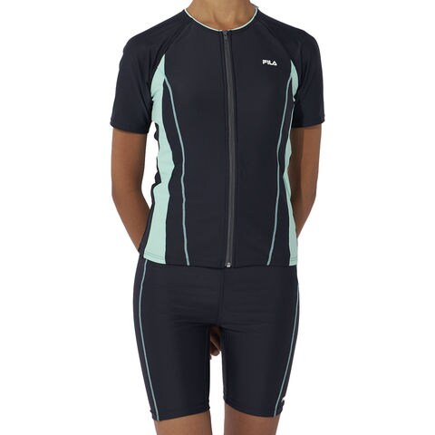 2WAY 方向によく伸びる生地を使用.ファスナー付で着脱が楽なセパレーツ水着.袖付きなので 2 の腕もカバー.カップの取替えができる挿入カップ式.アンダー内側の 15MM ゴムが胸を固定し綺麗に見せます.体に沿った切り替えとステッチの視覚効果でシャープな脇ライン.クイックジップ機能付き.ボトム前全面に伸びの良い裏地付.ウエストはスピンドル入りで調節可能.めくれ防止機能付. FILA ロゴプリント入