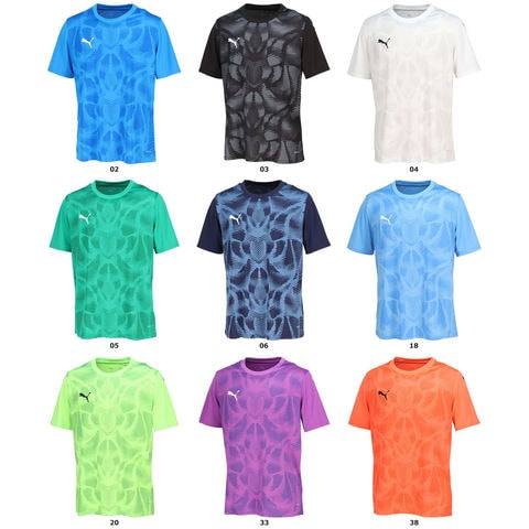 サッカー好きに最適なこのPUMAジャージーは、ダイナミックな全面グラフィック、クルーネック、究極のパフォーマンスを実現するスリムフィットが特徴.胸と袖にdryCELLテクノロジーとPUMAキャットロゴを配し、フィールド内外でシャープな印象を醸し出すデザイン.