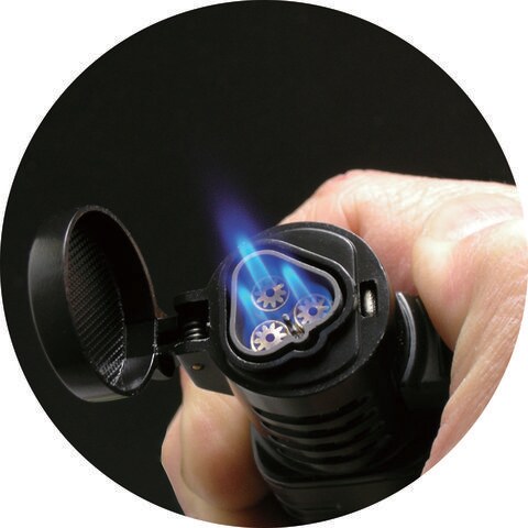 3 つのジェットフレームで強力なパワーを生み出します.レバーを押し下げるとワンアクションでキャップも OPEN .約 3.0G の大きなガスタンクに、底部も炎調整ラクラク操作.
