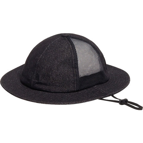 カジュアルな着こなしに適した、デニム生地のハット.頭部の一部にメッシュパネルを使い、通気性を確保しています.取り外し可能なあご紐付き.同色の刺繍ロゴがデザインのアクセント.キャンプや林間学校など、春から夏のアウトドアシーンに活用できるアイテムです.