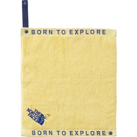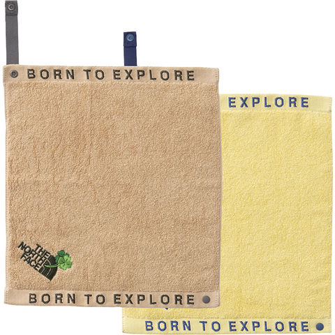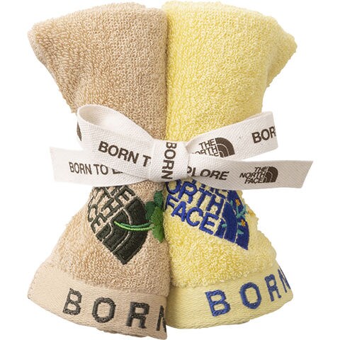 [初めての冒険][身の回りの自然]をテーマに、身近にある植物で染めたハンドタオル 2 枚のセット.オレンジ色はクローバー、黄色は菜の花で染めており、それぞれの花や葉の刺繍をあしらっています.パイル部分には、やさしい肌触りで風合いのよいオーガニックコットンを使用.生地に抗菌・保湿加工を施しています.ベビーカーなどに掛けることができるループ付きで、ループとドットボタンを留めると簡易的なスタイとして使うことも可能です. THE NORTH FACE BABY のタグライン[ BORN TO EXPLORE ]のリボン付きで、ギフトにもおすすめのアイテムです.