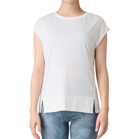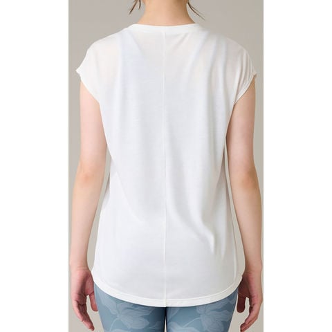 カットワークが印象的なフレンチスリーブトップ.前スリットからボトムの色が覗き、着こなしのポイントになると共に脚の動きを妨げず、ワークアウトに取り組めます.しっとり&なめらかな肌触りが心地よい天竺素材を使用したトップスシリーズ.トレンドに左右されず、長く着用して頂けるベーシックなデザインと色目での展開です.